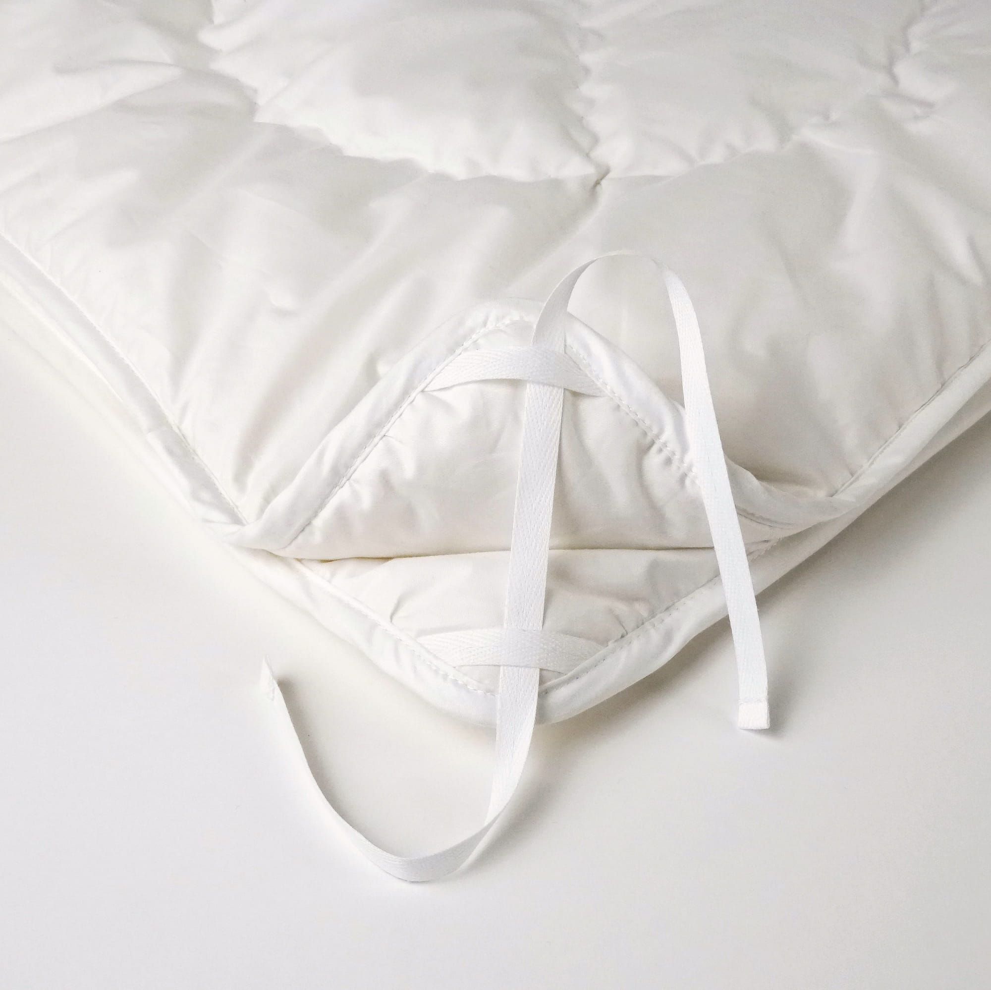 Patent Babuni: „uszka” wszyte w lamówkę kołdry, w każdym rogu i na środku każdego z boków, pozwalają przymocować kołdrę do poszwy. Dzięki bawełnianym troczkom wszytym od wewnętrznej strony każdej poszwy MyAlpaca, rogi kołdry nie będą się wysuwać z rogów poszwy. Proste.