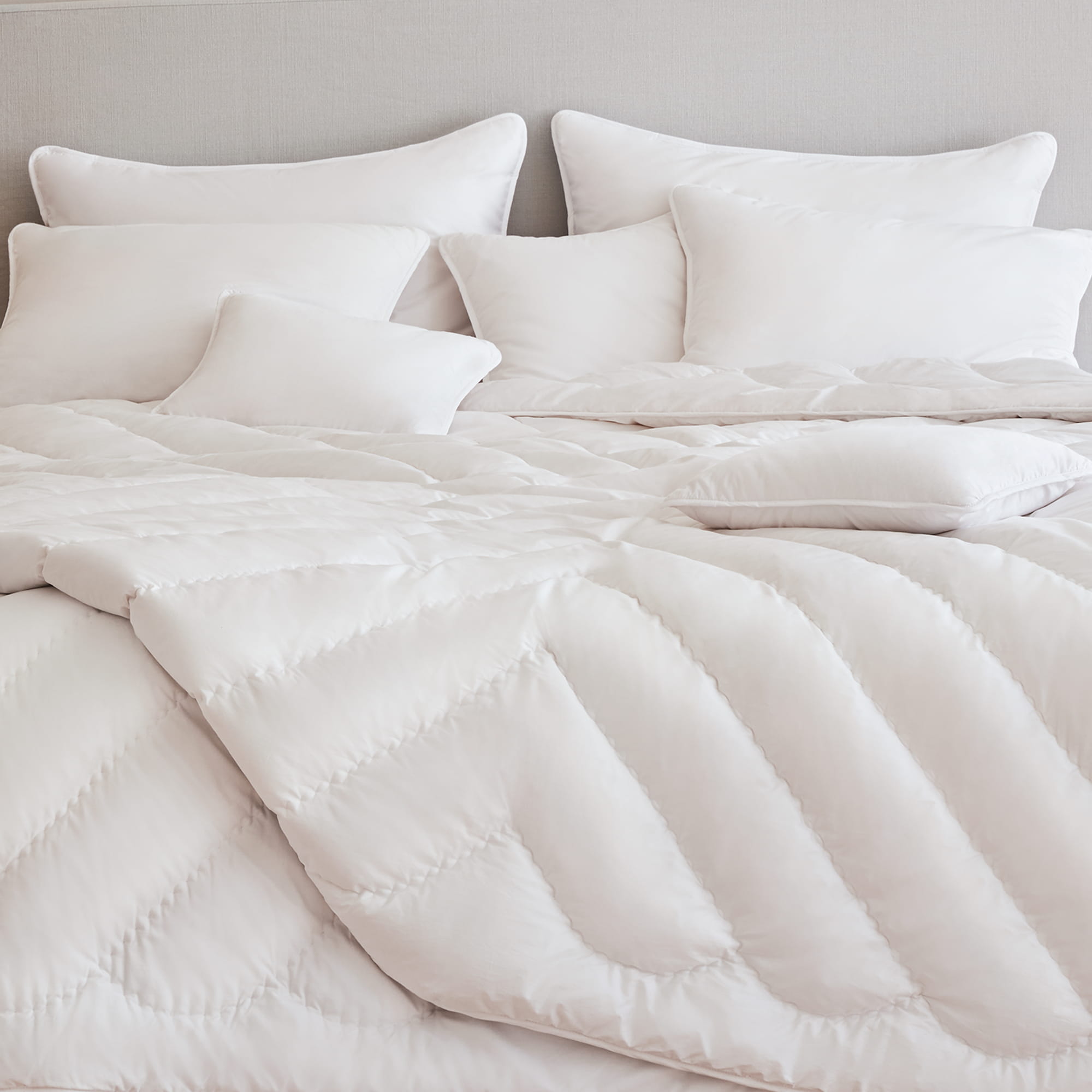 Kołdra całoroczna zawiera 400g włókna alpaki na m2 i jest idealna na cały rok. Dwie poduszki średnie, standardowe 50 x 70 cm. Wypełnione 100% włóknem alpaki o unikalnych właściwościach termoregulacyjnych i hipoalergicznych. Obszyte najwyższej jakości gęsto tkaną bawełną i wykończone białą lamówką.