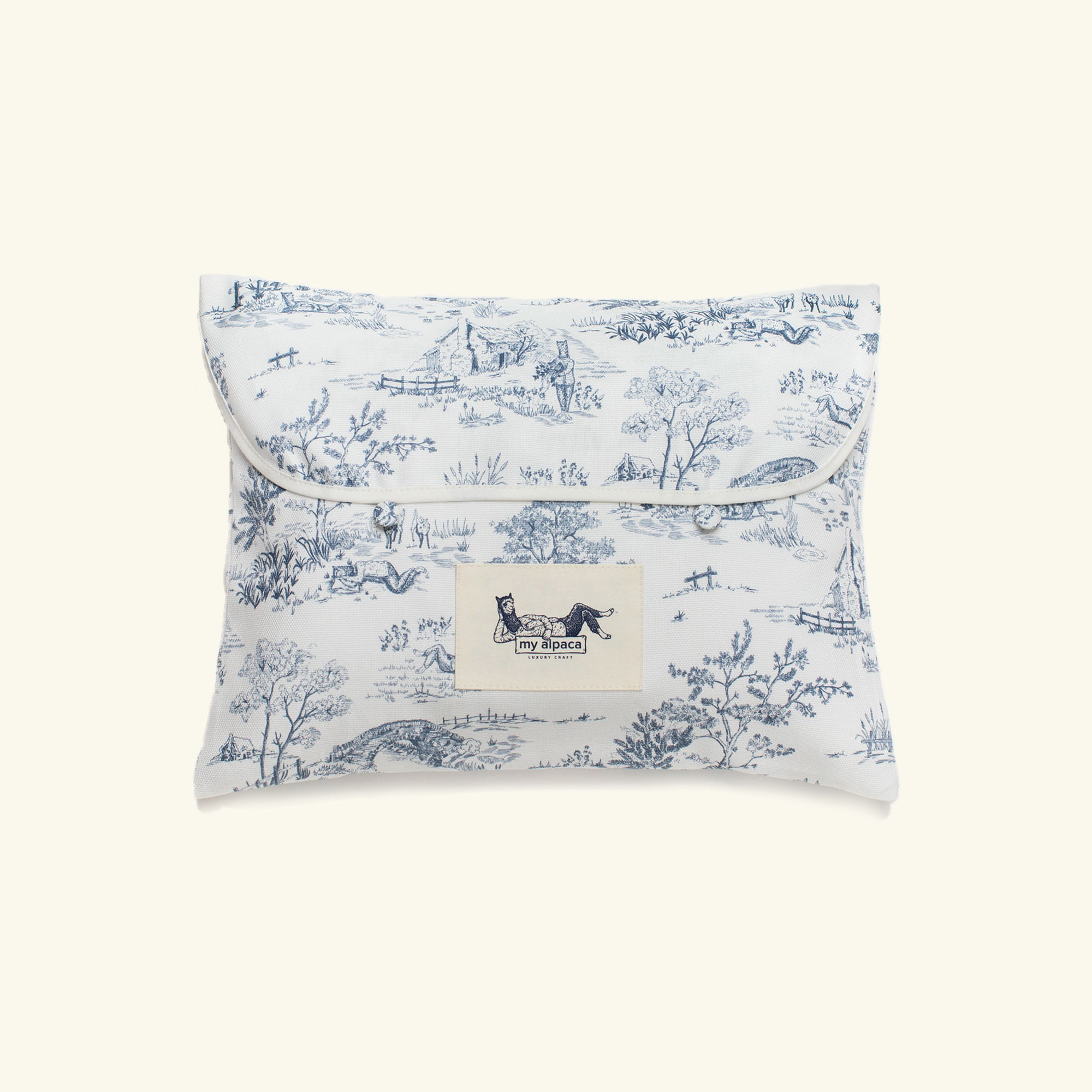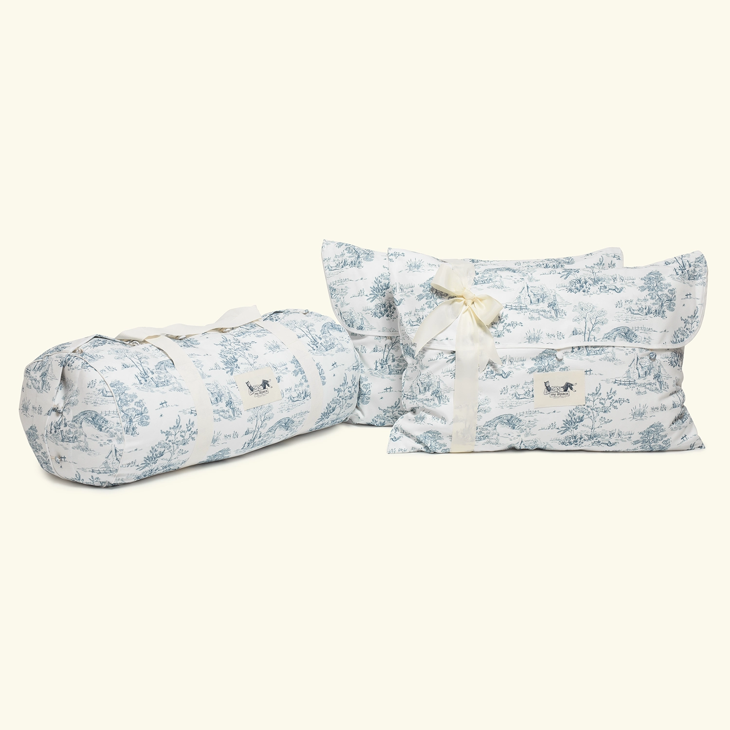 Kołdra zapakowana jest w bawełnianą torbę, a poduszki w bawełniane etui. Zapinane na guziki, uszyte z tkaniny z wzorem Toile de MyAlpaca.